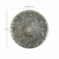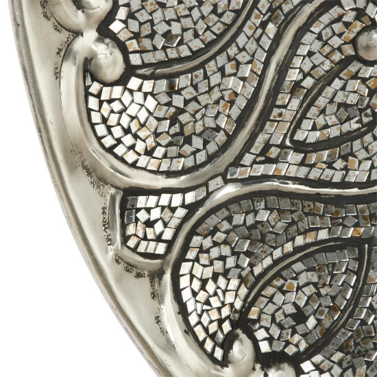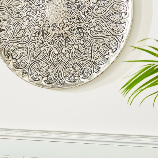 Add a show-stopping piece in glam style homes with this metal wall decor. Handcrafted in India, this extra-large round decor made from iron features arabesque patterns and textures in a polished silver finish. Metallic black, grey, and silver mosaic mirror details adorn the surface. Hang on walls in living spaces to elevate the sparkle and shine of modern and glam inspired interiors.