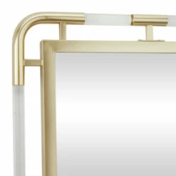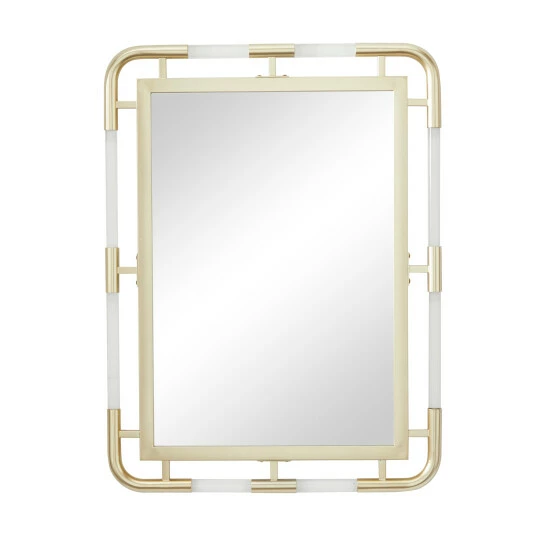 - Iron wall mirror features a metallic gold polished finish and a clear white acrylic finish
