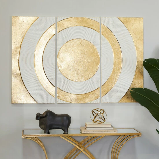 - An abstract wall decor highlighting glossy white and gold finishes for a modern style