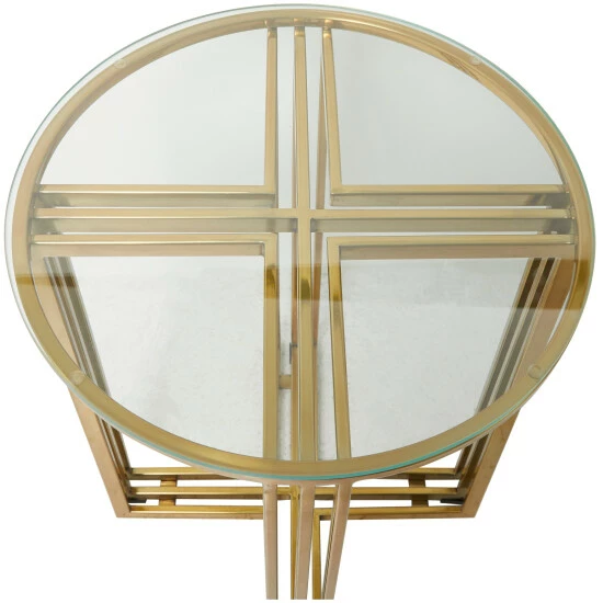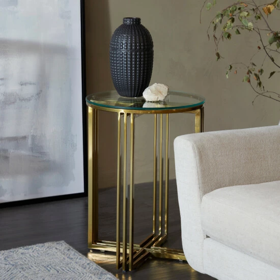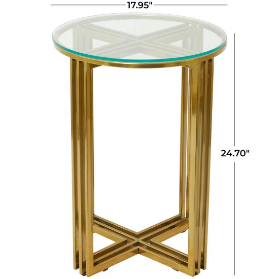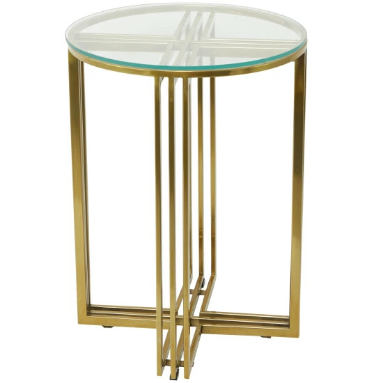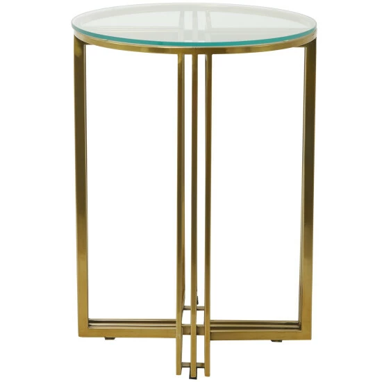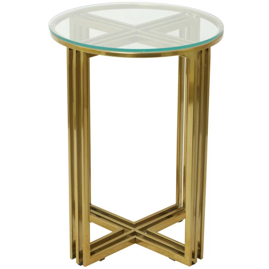 - Gold or Silver round end table features a clear glass top with geometric X frame base for a compact friendly display