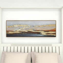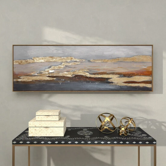 - Features abstract landscape in rich gold, beige, red and brown hues