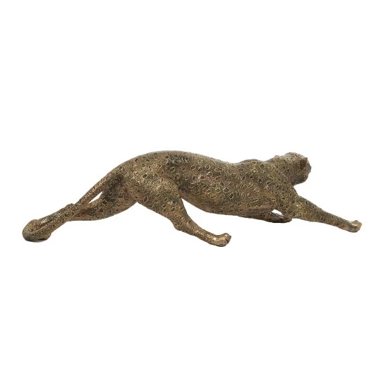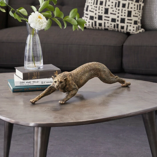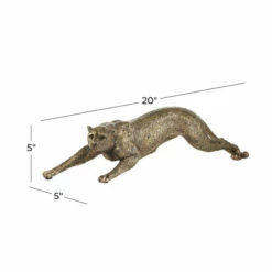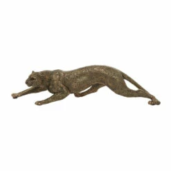 The rustic finish of this gold-painted polystone animal figurine gives it a contemporary feel. Turn it into an eye-catching centerpiece by placing it against bare wooden backgrounds. Its ridges are best appreciated under indoor lighting and with varying shapes and silhouettes in the surroundings. Take hardbound books, small potted plants, magazines, and desk clocks as examples. This charming panther tabletop and shelf figurine display stands 20″ long and 5″ high. Animal lovers and rustic theme aficionados match well with this display. Wipe clean with a dry cloth. Suitable for indoor use only. Contemporary design. This item comes shipped in one carton.