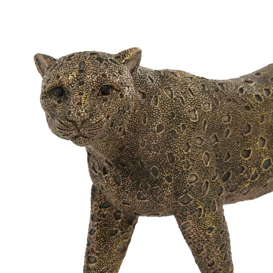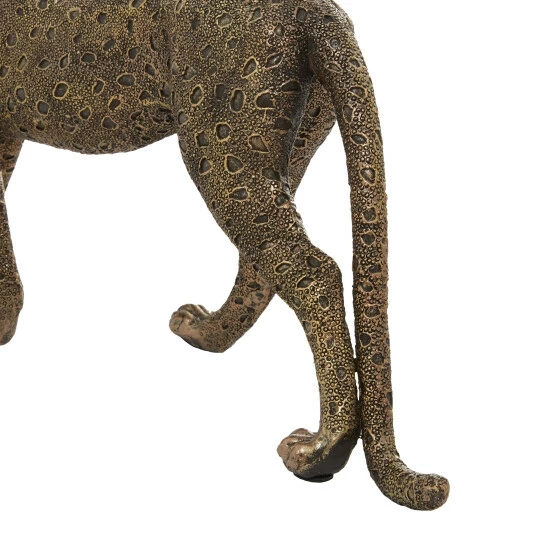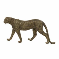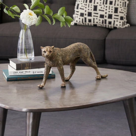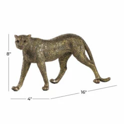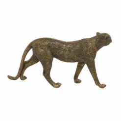 The rustic finish of this gold-painted polystone animal figurine gives it a contemporary feel. Turn it into an eye-catching centerpiece by placing it against bare wooden backgrounds. Its ridges are best appreciated under indoor lighting and with varying shapes and silhouettes in the surroundings. Take hardbound books, small potted plants, magazines, and desk clocks as examples. This charming panther tabletop and shelf figurine display stands 16″ long and 8″ high. Animal lovers and rustic theme aficionados match well with this display. Wipe clean with a dry cloth. Suitable for indoor use only. Contemporary design. This item comes shipped in one carton.