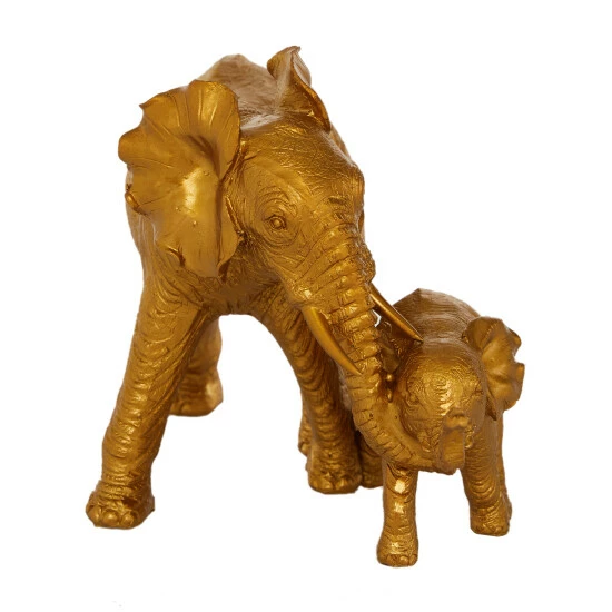 Bringing light, jovial spirits with gilded shine, this mother and baby elephant sculpture adds a unique and eclectic touch to any space! Finished in metallic gold paint, this table decor sculpture depicts a larger elephant walking and guiding a smaller baby elephant. Each elephant sculpture is detailed throughout and are connected as one unifying statue. The sturdy base features scratch-resistant rubber stoppers to safely display on any surface. Designed with black rubber stoppers at the base that prevent scratching furniture and table tops, as well as sliding around. This item is shipped in one carton. Suitable for indoor use only. Eclectic theme.