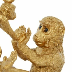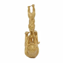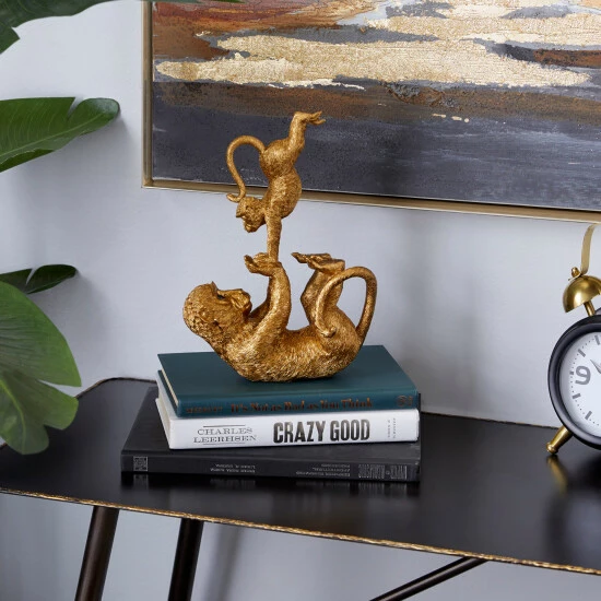 Bringing light, jovial spirits with gilded shine, this mother and baby monkey sculpture adds a unique and eclectic touch to any space! Finished in metallic gold paint, this table decor sculpture depicts a larger monkey on its back holding the hands of a smaller monkey doing a handstand. Each monkey sculpture is detailed throughout and each have glossy black eyes for a more realistic look. The flat back of the larger monkey provides a sturdy base with a scratch-resistant finish to safely display on any surface. This item is shipped in one carton. Suitable for indoor use only. Eclectic theme.