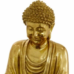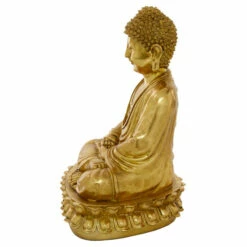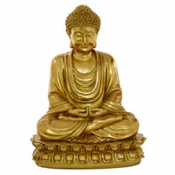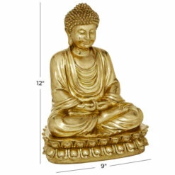 Solid polystone resin was given a shiny metal finish in this Sitting Buddha sculpture. Its golden glam exterior makes it a versatile piece that can fit in any interior concept, modern or traditional. However, its color is best appreciated against light and neutral tones. Display it on an altar or next to small potted plants on top of a table or dresser to complement its life-like theme. Brighten up any dark interior surface with this unique sculpture for peaceful atmosphere. Wipe clean with a dry cloth. Suitable for indoor use only. Glam inspired. This item comes shipped in one carton.
