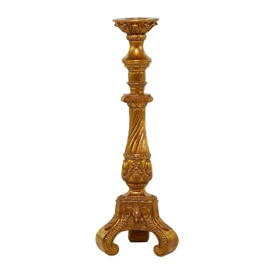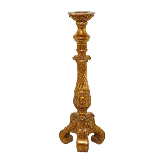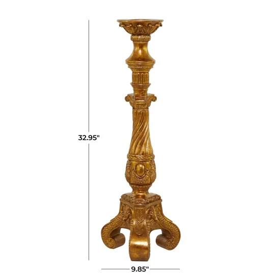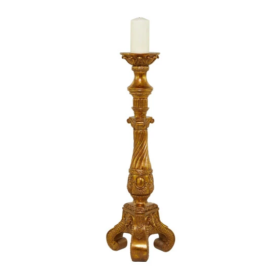 Light up your living room or bedroom space with this gold pillar candle holder as centerpiece or accent decor to set a traditional and romantic mood. Made with a sturdy base, it is perfect for creating an elegant atmosphere any room in your home. Furnished with plate to hold one pillar candle. Item comes shipped in one carton. Suitable for indoor use only. Traditional design.