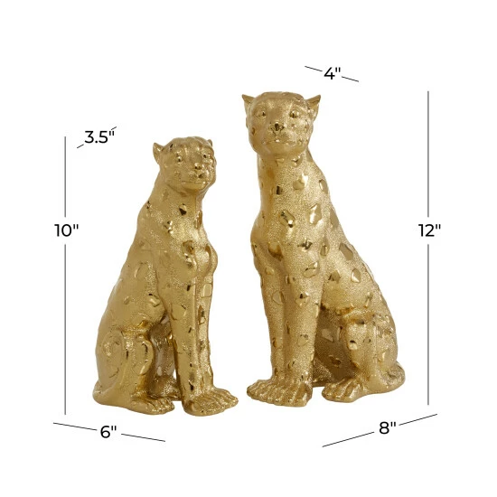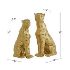 The glam finish of this polystone animal figurine set gives it an eclectic edge. Turn it into an eye-catching centerpiece by placing it against plain colored backgrounds. Its shiny embossed patches are best appreciated under indoor lighting and with varying shapes and silhouettes in the surroundings. Take hardbound books, potted plants, magazines, and desk clocks as examples. These charming leopard tabletop and shelf displays stand 12″ and 10″ high, respectively. Add glamour and personality to your console, coffee, and end tables with these leopard sculptures. Wipe clean with a dry cloth. Suitable for indoor use only. Each set comes with 2 leopard sculptures. Glam inspired. This item comes shipped in one carton.
