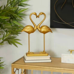- Decorative sculpture featuring 2 flamingos in a kissing position that forms a heart shape and highlights a gold finish, textured feathers, long slender legs, detailed feet, and rectangular base