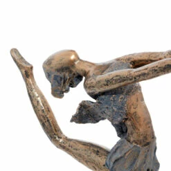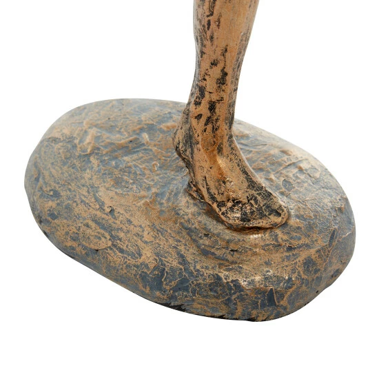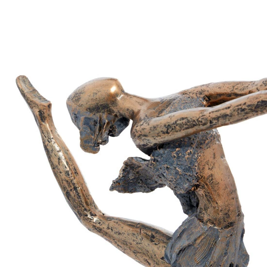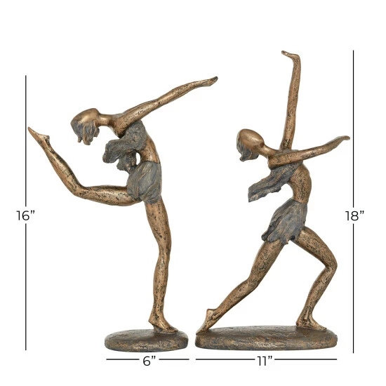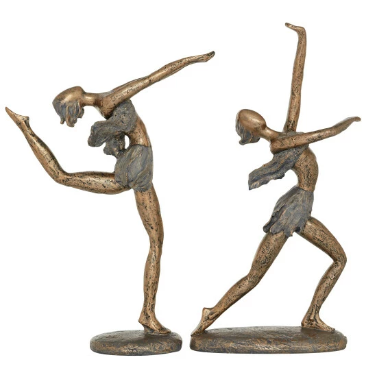 Here is a set of dancing human figurines showcasing dynamic ballet movements through the use of lengthened limbs in the design. Each of the two sculptures has a distressed gold finish and a stand. Place them on a bare wood furniture top or on a mantelpiece inside a contemporary or traditional room to best admire their silhouette. These 11″ and 18″ table displays were made from the combination of stone and resin. Bring life to your bare consoles and counters with these elegant and charming dancer sculptures. Wipe clean with a dry cloth. Suitable for indoor use only. This is a 2-in-1 set of human figurines. Traditional style. This item comes shipped in one carton.