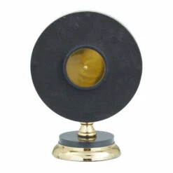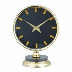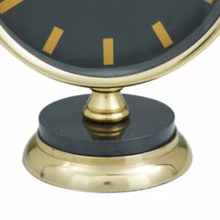 - This table clock accentuates a black round clock face with gold lines serving as numbers along with black marble stand and gold round aluminum base
