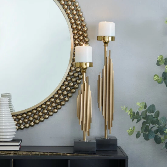 - Gold pillar candle holders features wide plates for secured display and a vertical stand that resemble pipe organs with collages of metal rods on a premium marble base