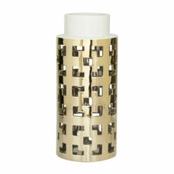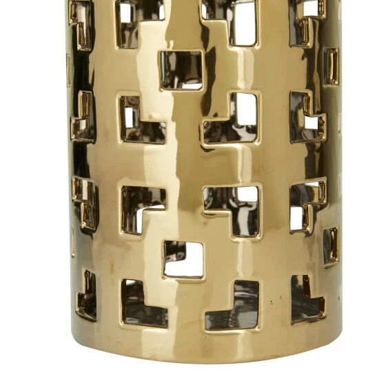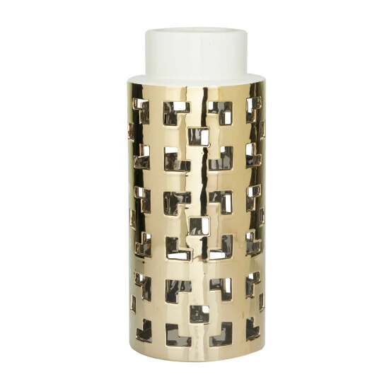 - A white vanilla neck highlights the geometric cut-out patterns on the body of this cylinder vase