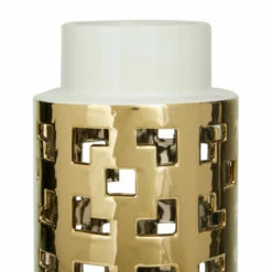 - Metallic gold and glossy white finish flaunts this ceramic decorative vase