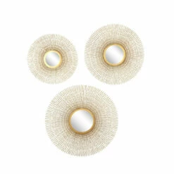 Add uniqueness and texture to your bare walls with these sunburst wall mirrors from Studio 350. This set of wall decor features three gold-finished circular iron frames with thin wires and reflective mirror centerpieces with inner gold-finished band frames. Its gold finishing brings an elegant vibrant shimmer to your space while its mirrored centerpieces create a wider perspective to your room. Get these decorative wall mirrors today and give your room an elegant, modern update!