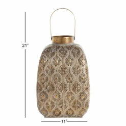- Metal candle lantern has a distressed gold finish for an aged look