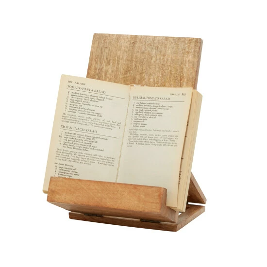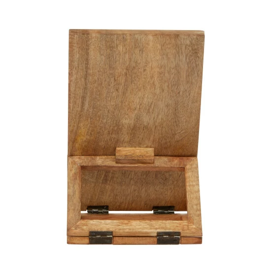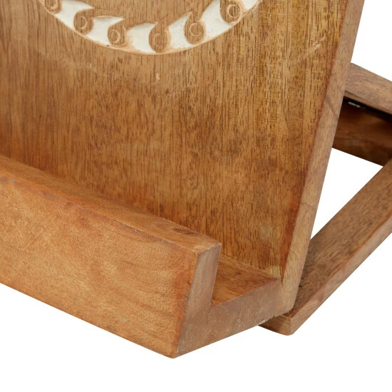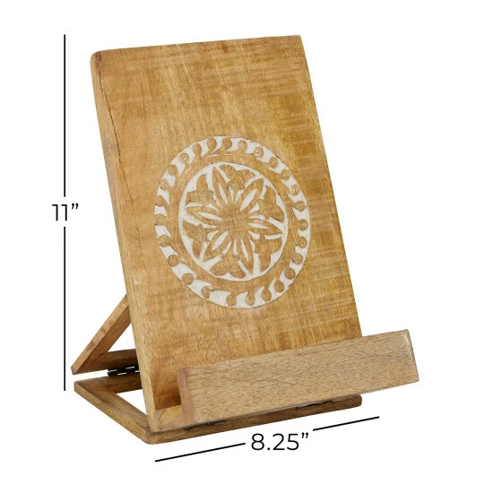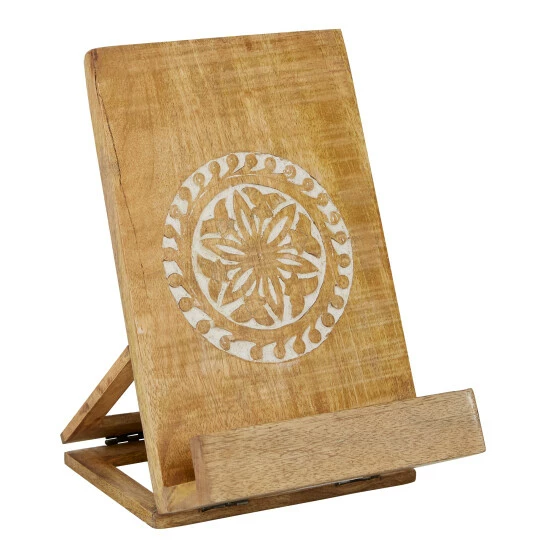 Add beautifully natural, earthy home decor with function to your kitchen, or any room of the house, with this wooden book holder. The warm natural golden brown wood boasts lovely wood grain and features a carved floral design in a circle in the center with natural white contrast when carved into the wood. The easel stand construction allows you to place your book propped up with a curved lip at the base to keep your pages open. This makes a great addition to your kitchen to use as a cookbook stand, but can also be used as accent decor displaying an art book, photo album, or any other book in any room of the house!. This item ships in 1 carton. Suitable for indoor use only. Made in India. Country Cottage vibe.