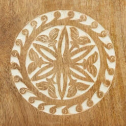 - Natural golden brown wood grain with carved floral pattern