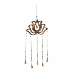 Close your eyes and say goodbye to all your worries as you sit back, relax, and meditate. Namaste. Now, let the sound of wind be the focal source of inner peace and overflowing chakra as they slowly drift into your home’s entryway and tall wooden windows with this eclectic inspired, extra-large sized golden lotus flower windchime! This stunning home decor showcases an open design golden lotus flower windchime base made of pure mango wood. They are designed with five hanging, triangular-shaped iron windchimes and multi-colored glass bead string accents and are ideal home decorations for entryways, living rooms, balconies, outdoor gardens, and backyard patios. This item comes shipped in one carton. Item features metal ring for easy and secure hang. Suitable for indoor use. Made in India. Eclectic theme.
