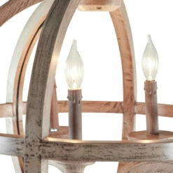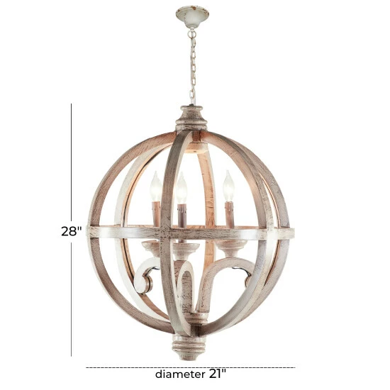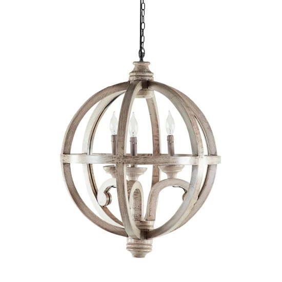 This Chinese red pine made chandelier takes a gridded globe like shape to hold three classic candelabra style light bulb holders at its center. Its overall exterior was given a distressed gold finish to suit antique, cottage chic, and rustic themed interiors. Use it to lighting decoration in foyers, dining halls, bars, porches, and hallways. LED crew base candelabra. Wood pendant light includes hanging chain and hardwired canopy. Suitable for indoor use only. Hardwired hanging lighting. This item comes shipped in one carton.