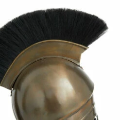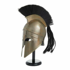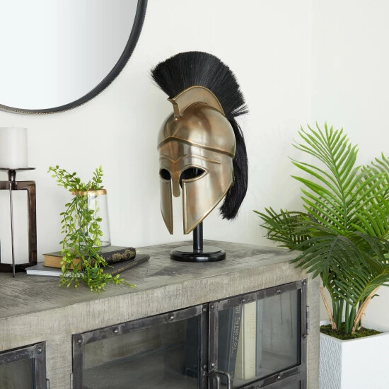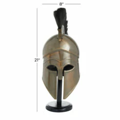 Give your home a vintage, historical look with this decorative Spartan helmet. Made of durable iron with a metallic gold finish, this helmet has an authentic look. The built-in wood stand lets you easily display this helmet on any flat surface.