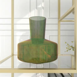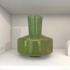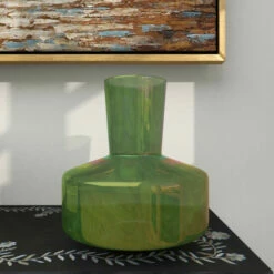 Make an eye-catching statement with this unique vase, featuring opalescent tempered glass… The interesting silhouette boasts a vertical cylinder vase shape with a wide horizontal cylinder section towards the base. The entire glass vase has a leafy, earthy green hue with textural brushstroke patterns within the glass. When light hits, you can enjoy the luminous opalescent rainbow sheen that glows off the glass! This waterproof vase makes a beautiful fresh flower bouquet display, or position as a stand-alone modern table decor piece.