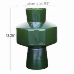 This green vase is an earthenware made from molded glass. It works as a vase, as a dรฉcor holder, and as a tabletop exhibit, offering both style and function for shabby chic and mid-century modern interiors. Its shaft is wide at the center and has a narrow opening. It stands 13.25″ tall and is best used as a standalone decor or with fake flowers as it does not have drain holes.