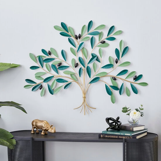 Create an excellent focal point on your walls paired with some cute accent tables, and level up your home with this amazing wall Decor. It makes a great centerpiece over your sofa or in your dining room. Bring your home vibe closer to nature with this tree metal wall Decor. Wipe clean with a dry cloth. Coastal theme. Easy to hang with nail or screw via ring hardware on the back. This item comes shipped in one carton.. Designed with a coastal inspired theme for a calming and relaxing vibe. This contemporary tree decor is crafted with the use of metal assemblage. It feature 2 shades of green finish for leaves, black finish for fruits, and metallic gold finish for trunk and branches. This metal crafted piece is designed as a 2D wall art. It measures 40″L x 2″W x 31″H and weighs 5 lbs