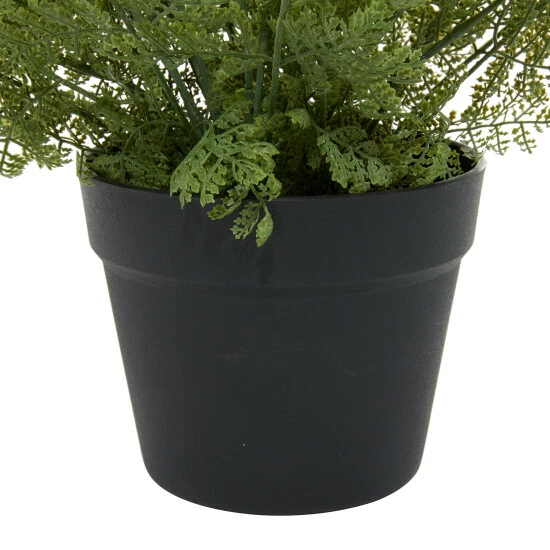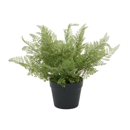 Add some natural pops of green throughout your living space with this lifelike artificial plant decor. Made from polyethylene and iron, this decor mimics the look of a small fern in a black planter. The decor is 17″ tall, and you’ll have an easy time finding space for it on a desk or end table. Add it to your living room, office, hallway — anywhere that could benefit from its realistic and colorful design. This item comes shipped in 1 carton. This accent piece features artificial foliage made of polyethylene with metal container. Suitable for indoor use only. Traditional theme.