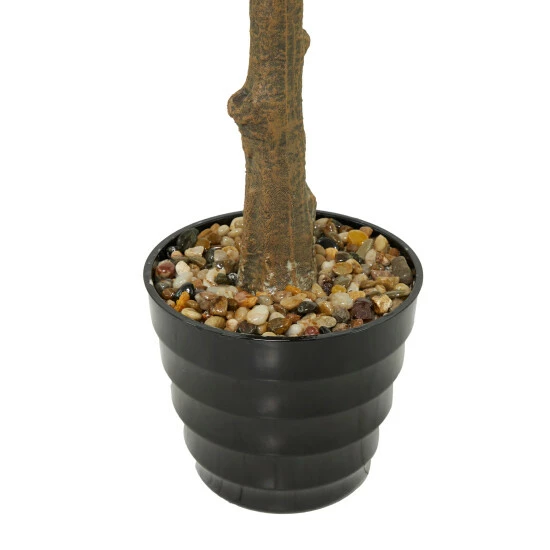 - An artificial plant arrangement featuring a tall douban plant with a green finish, realistic leaves, branches, and trunk along with decorative pebble stones and black segmented cylindrical container