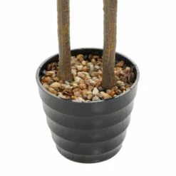 - An artificial plant featuring green leaves and brown trunks with a black container