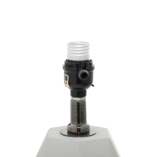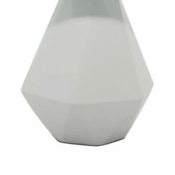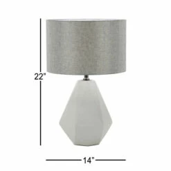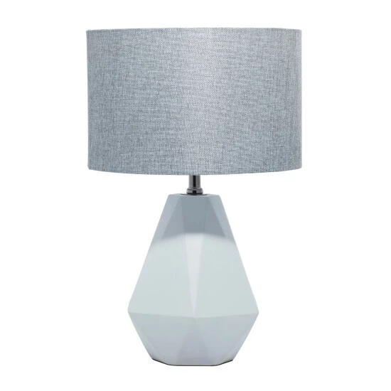 - Features a gray fabric drum shade and a faceted pear-inspired lamp body