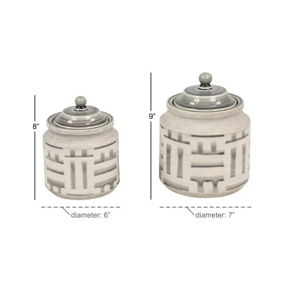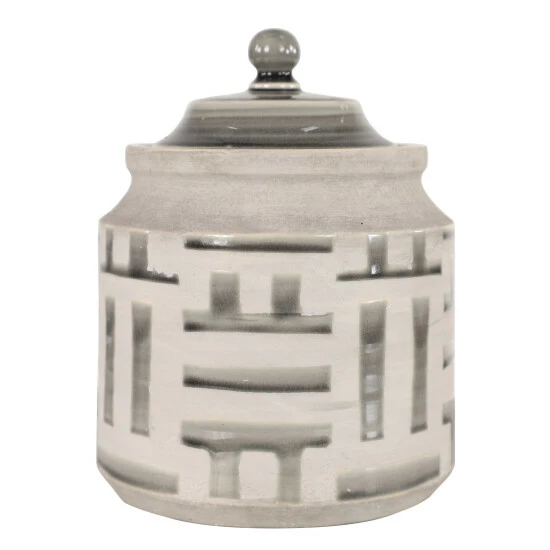 - This country style inspired design gray ceramic jar set features a tribal pattern of lines on its cylindrical body furnished with a round lid with a spherical handle