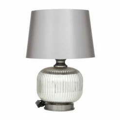 - Decorative table lamp with a gray shade and base as well as a silver body