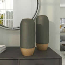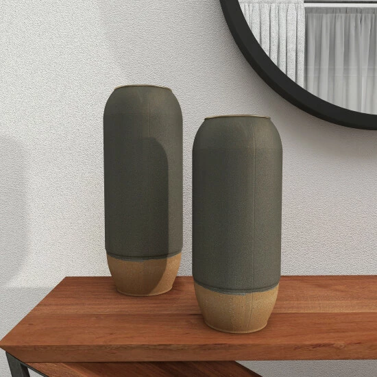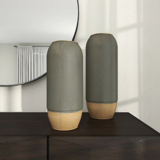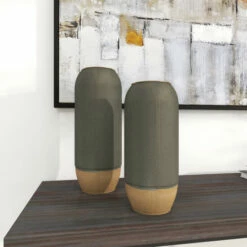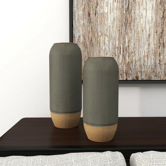 Pair together or break up this 2-in-1 set of metal cylinders to offer your home both style and function. They work as vases, as decor holders, and as tabletop exhibits for contemporary or modern interiors. Bodies are made of iron coated to have a ceramic-like finish. Best used as standalone decors or with faux flowers and botanical. Suitable for indoor use only. Vases do not have drain holes. Vase measures 4″ mouth openings. This set include two vases. This item comes shipped in one carton.