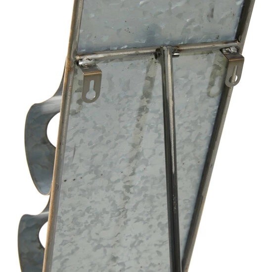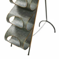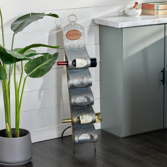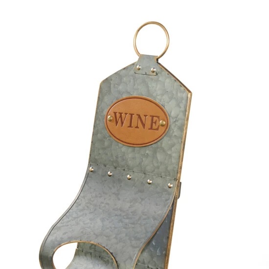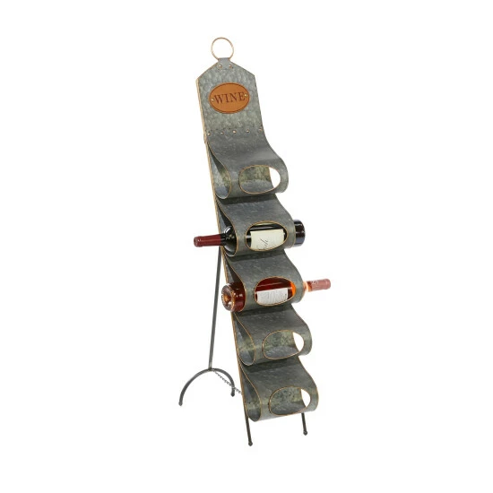 Display your wine bottles with this grey farmhouse 5-bottle metal wine holder with floor stand. Made with galvanized metal, this wine bottle holder is made with 5 metal loops as bottle holders that is securely supported by metal front and back bipod floor stands. It also highlights a faux leather lettered wine label and a single metal ring handle. Placed on your dining or living room walls, this wine bottle holder is a rustic addition to your farmhouse-themed home. This item comes shipped in one carton. Suitable for indoor use only. This item can sturdily hold 5 wine bottles. The word “WINE” is stamped on the PU leather label. Contemporary design.