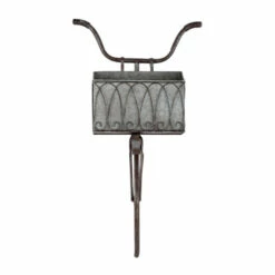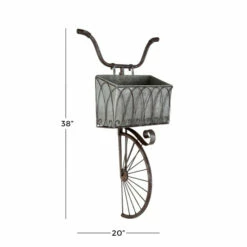 This unique wall planter features an antique style bicycle sculpture with rusted brown handlebars, scrolled fender, and metal wheel cradling a large front basket with decorative scrollwork. Inside, a large rectangular galvanized metal plant box can securely hold and display your favorite flowers, herbs, or plants. The bicycle wall decor looks like its popping out from your wall, creating an eye-catching centerpiece in your patio, deck, or garden area. This outdoor planter is easy and ready to hang by built-in hardware. Add some flowers or plants to complete its stunning look, and perfect to hang on any light-toned wall Wipe clean with a dry cloth. Metal wall planter basket in an antique style bicycle Easy and ready to hang by keyhole hardware. Suitable for indoor and outdoor use No drainage holes Farmhouse-themed style. This item comes shipped in one carton.