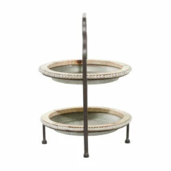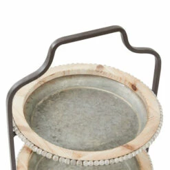 Organize your home spaces with this farmhouse grey galvanized 2-tier metal serving tray with wood accents. Each galvanized metal tier plate is decked with wooden accent rims and wood beads with natural light brown finish. This ensemble is held together by an iron frame that extends to a single handle and 4 feet to hold it up. Placed on your indoor or outdoor tables, this 2-tier serving tray is a charming blend of modern and rustic vibes for your farmhouse-themed home. This item ships in one carton.