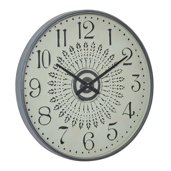 - This farmhouse style inspired wall clock features a perforated clock face forming feather patterns and cutout number markers