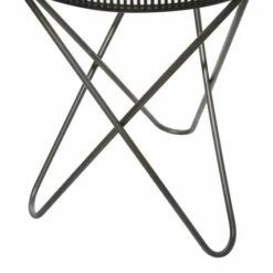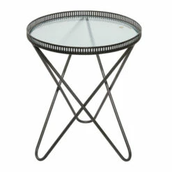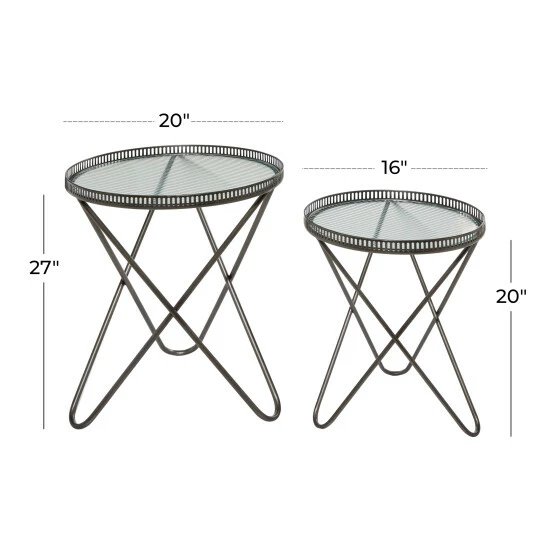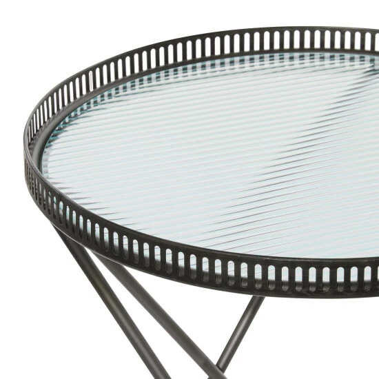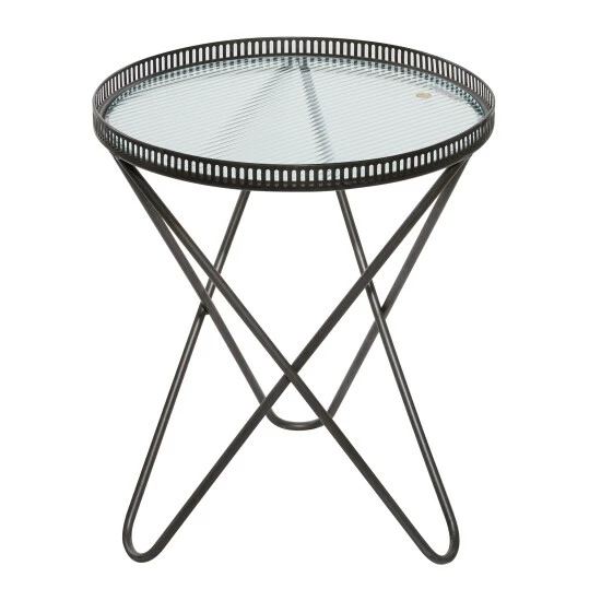 - This round glass and metal side table set features 2 pieces of elegantly crafted solid iron base and round glass surface in an industrial style inspired design