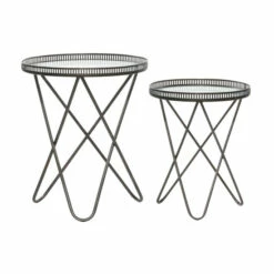 - Pair of round metal tables measure 19.5″L x 19.5″W x 26.5″H, 15.75″L x 15.75″W x 19.5″H and collectively weigh 9 lbs