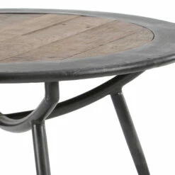 - This exquisite black metal coffee table showcases a short and round table shape with a wooden table top and geometric-styled iron legs