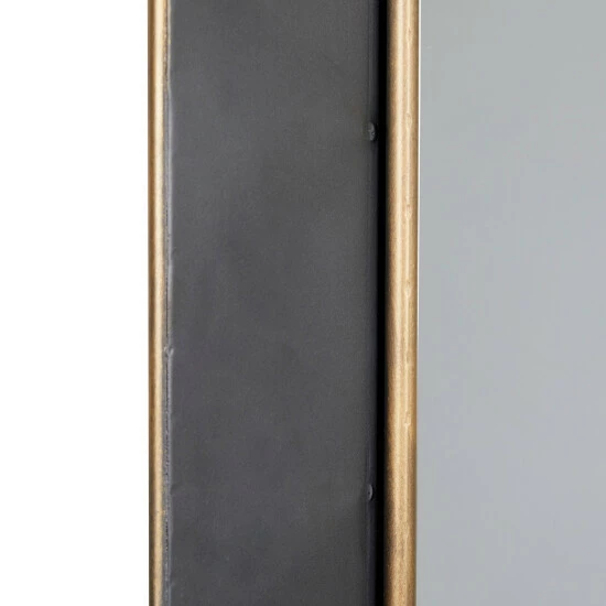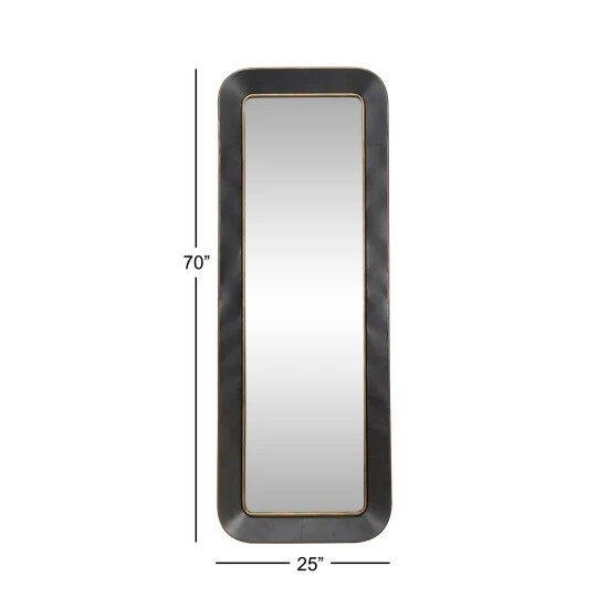 This large, rectangular floor mirror adds simple, cool style to your industrial-styled space. The dark black metal frame has rounded corners and is neutral yet bold with brushed metallic gold around the edges. Added dimensional touch from the metallic gold metal piping around the interior of the gray frame. Create an excellent focal point on your walls paired with some cute accent tables, and level up your home with this amazing wall Decor. Easy to vertically hang by the metal hardware in the back. Suitable for indoor use only. This item comes shipped in one carton.