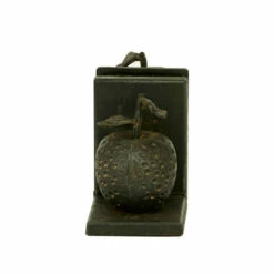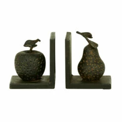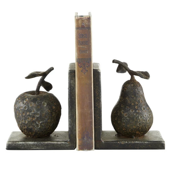 - These metal bookends carry rustic gray finishes on both the fruit sculptures and platforms