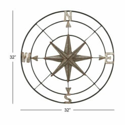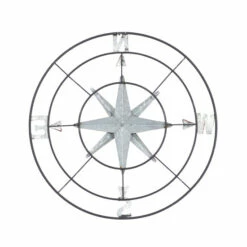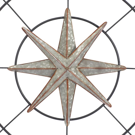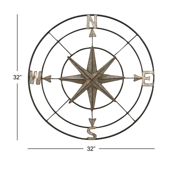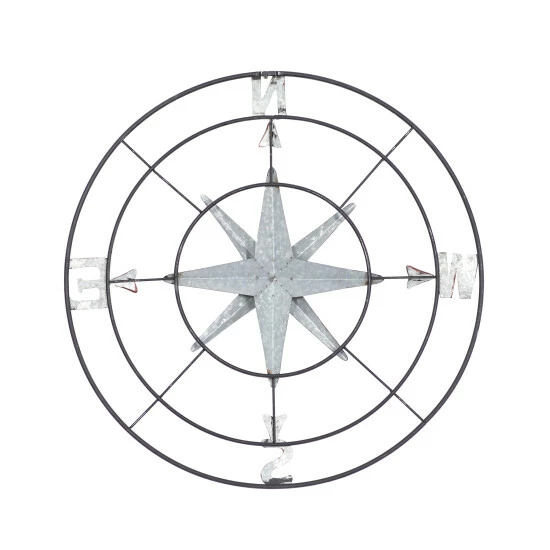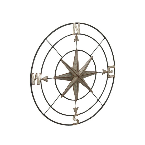 - Metallic silver galvanized metal 3D 8-point star and large N, E, S, W directional markers with arrow points, black iron rings form the compass frame with easy to hang sawtooth hardware