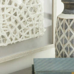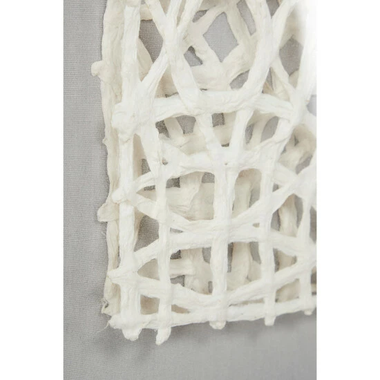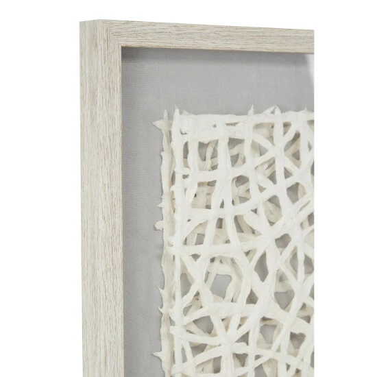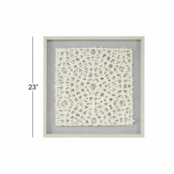 This very dimensional abstract art wall decor piece has 2 layers of hand-cut paper in a decorative square design similar to a doily. The 2 layers create depth and dimension between the paper cutouts with the gray cotton fabric back popping through. The entire paper wall art piece is housed in a distressed white square frame with a clear cover. The rich texture of the white hand-cut paper designs in this shadow box wall art piece makes a dimensional focal point in any room. Ready to hang with attached D-ring hardware. Due to the handmade nature of this item, no two will be alike, there will be slight differences in shape, size, and color. Suitable for indoor use only. Coastal theme. This item comes shipped in one carton.