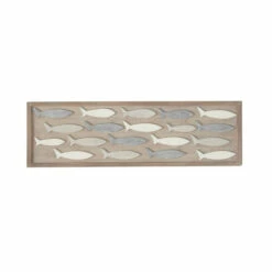 Accessorize your living space with this wooden school of fish wall panel. This charming home decor features a brown rectangular wooden frame and fish figures in gray, white, and brown finishes. This wall decoration is made of wood and suits coastal themed interior that craves for a stylish home design. Hang this amazing piece in your home to bring a relaxing and feel-good atmosphere to your space. There are keyholes on the back for easy hanging. Suitable for indoor use only. This item comes shipped in one carton.