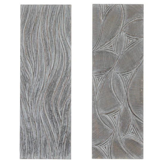 - This gray wall decor set features intricate linear grooves forming nature-themed patterns