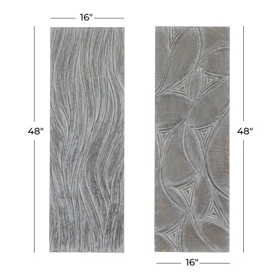 Made in India, this two-piece wood panel decor brings sophistication and dimension to a room. No matter where you hang them, these stately wood art panels draw attention. A closer inspection reveals intricate grooves that form natural-looking patterns on each panel. This set of wall art has a neutral palette that fits into a variety of decorating schemes. Hang the panels in an entryway to greet guests, or place them in a living room to elevate the room’s look. Keyhole hangers for easy placement. Suitable for indoor use only. This is a 2-in-1 set of rectangular wall Decor. Modern theme. This item comes shipped in one carton.