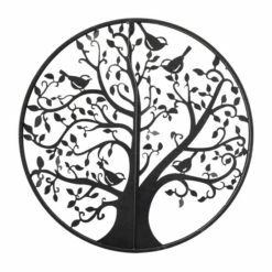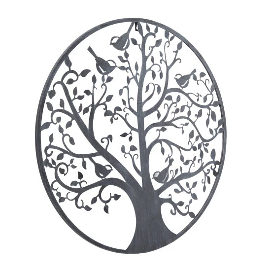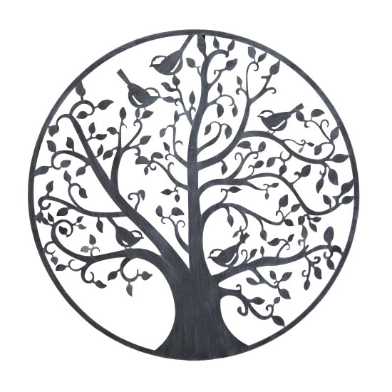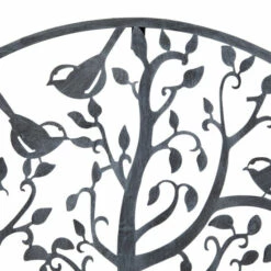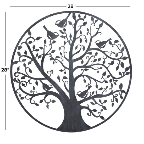 - Gray metal botanical wall decor with a round frame furnished with a cut-out tree-inspired design with curved branches, small leaves, and bird details